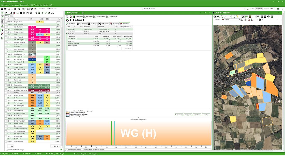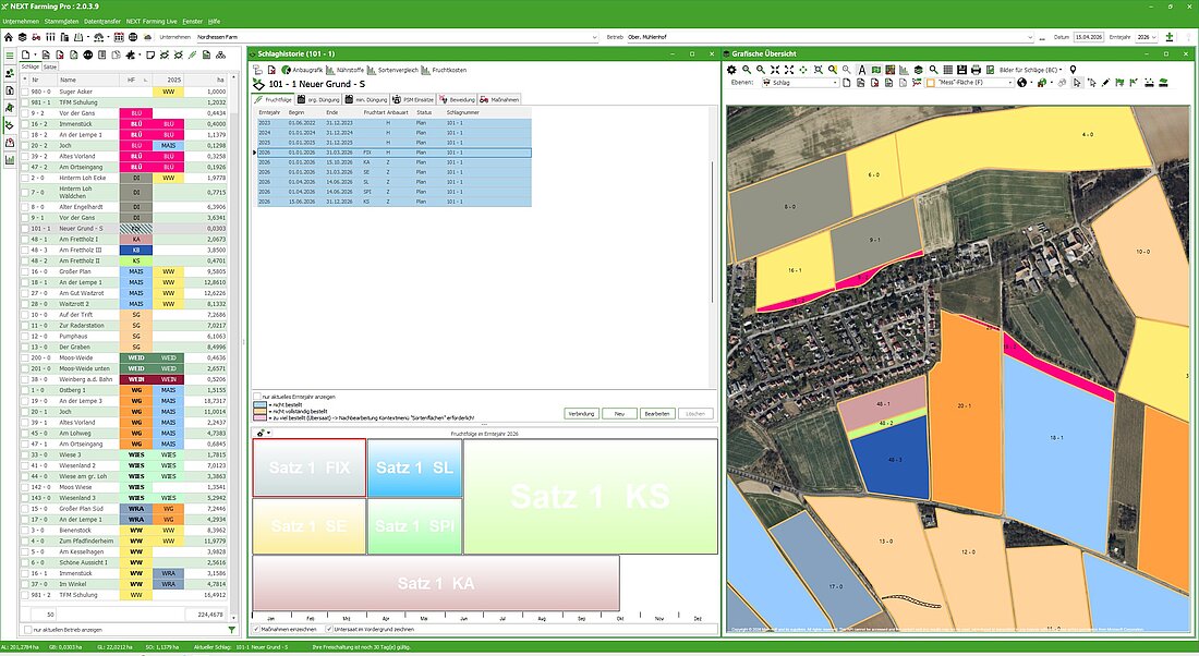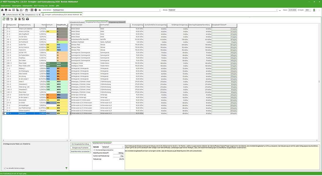Unser neues Farm-Management-System NEXT Farming Pro ist die beste Wahl für Ihre Profi-Anforderungen. NEXT Farming Pro zeichnet sich durch seine sehr hohe Kompatibilität zu anderen Systemen aus. So vernetzen Sie Dateninseln und holen strukturiert das Maximum an Informationen aus der täglichen Datenflut heraus. Die neu gestaltete, intuitive Oberfläche unterstützt Sie durch verbesserte Workflows und ermöglicht schnelles Arbeiten im Büro. Die Startseite zeigt Ihnen alle pflanzenbaulichen und wirtschaftlichen Vorgänge übersichtlich an – so behalten Sie alles im Blick. Anbauplanung, bundeslandspezifische Düngebedarfsermittlung, Stoffstrombilanz, mobiles Dokumentieren mit der App von NEXT Farming, Anbindung an alle gängigen Terminals, Teilflächenmanagement, Ackerschlagkartei und vieles mehr vereint unserer Agrarsoftware NEXT Farming Pro in einer Anwendung. Besondere Highlights sind der neue Geodatenkatalog und die automatisierte Erstellung von Applikationskarten für Düngung und Pflanzenschutz.